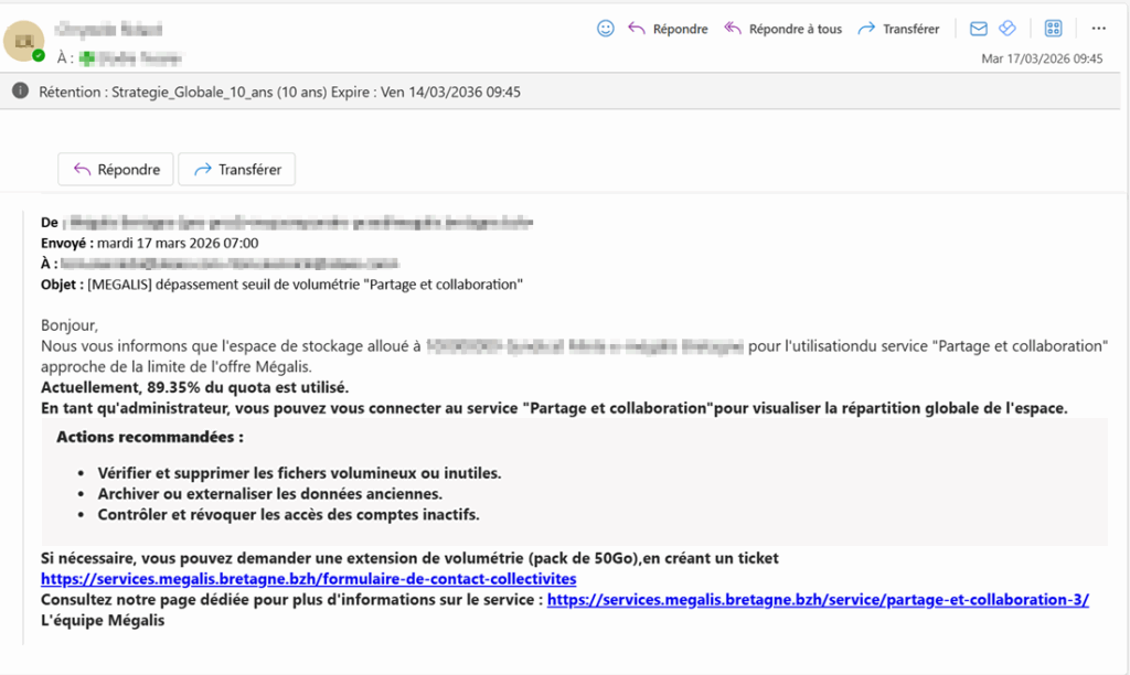 Un mail est envoyé à l’administrateur de la collectivité dès que le stockage dépasse les 80% de sa capacité totale.