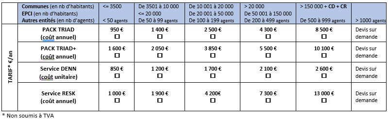 Voici les tarifs (coût annuel HT) en fonction de la typologie de l’entité :