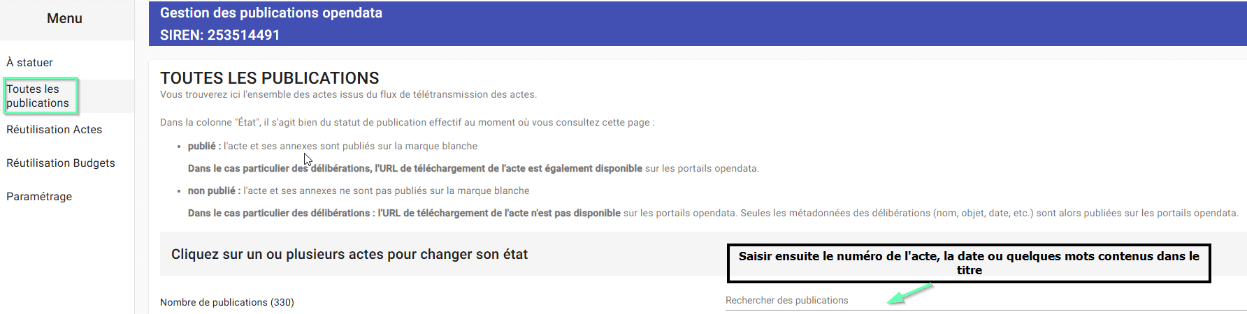 Une fois le service ouvert, aller sur Toutes les publications, puis dans le champ « Rechercher des publications » saisissez une date, un numéro ou bien une chaine de caractères, vous permettant de retrouver votre acte.