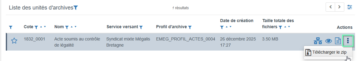 Si vous cliquez sur les 3 points cela vous permet de télécharger l’archive au format ZIP néanmoins, vous ne trouverez pas l’acte tamponné par la préfecture