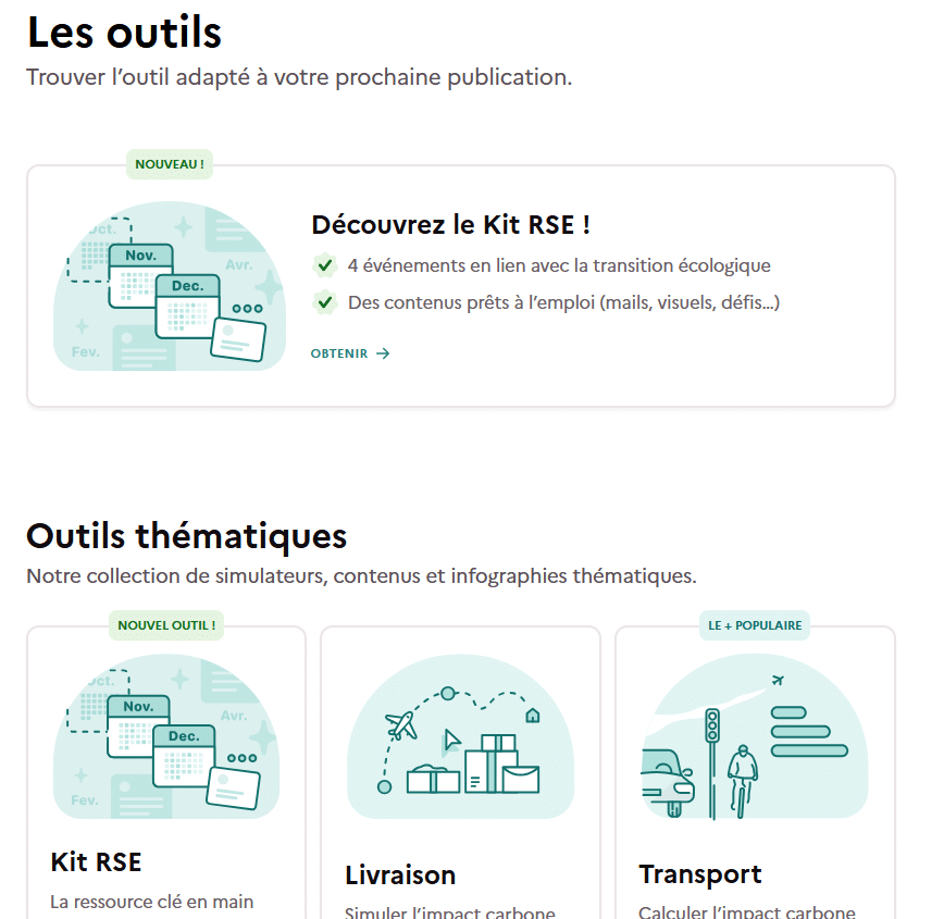 L’ADEME (Agence de l’environnement et de la maîtrise de l’énergie) mets à la disposition de toutes et tous des outils pour comuniquer sur l’impact carbone. Développés pour les entreprises, les associations, les médias et les collectivités, nos outils s’ajoutent à vos sites et applications en quelques clics. 100% gratuit.
