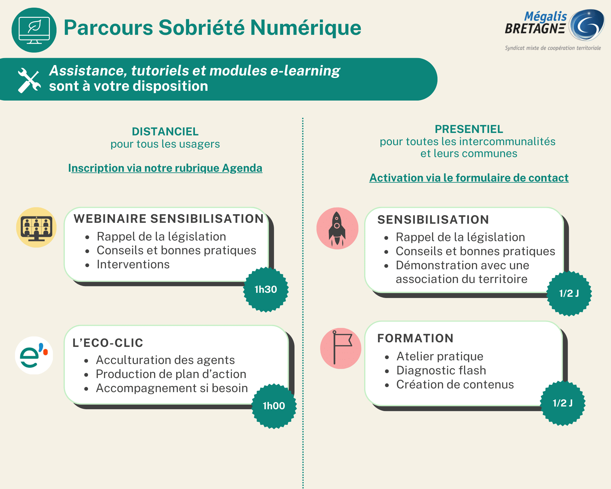 - la rubrique “Se sensibiliser” pour prendre connaissance du parcours sobriété numérique proposé par Mégalis Bretagne,