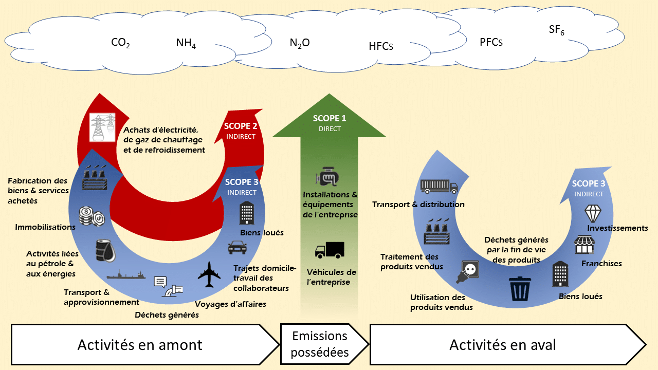 La mesure de l’empreinte carbone pour une entreprise s’effectue au travers de trois scopes :