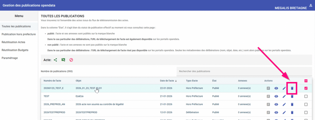 Ce tutoriel est destiné aux collectivités, il vous montre comment supprimer un acte dans la marque blanche de publication des actes.