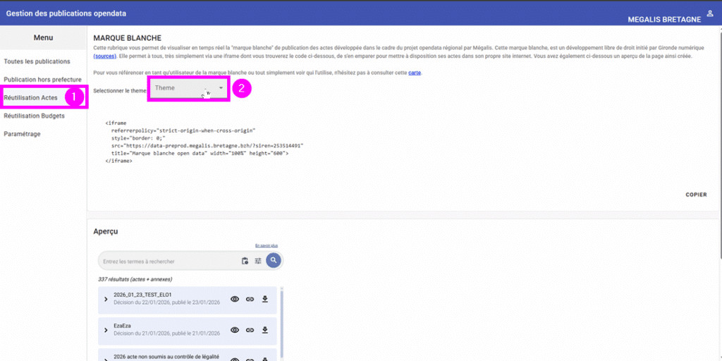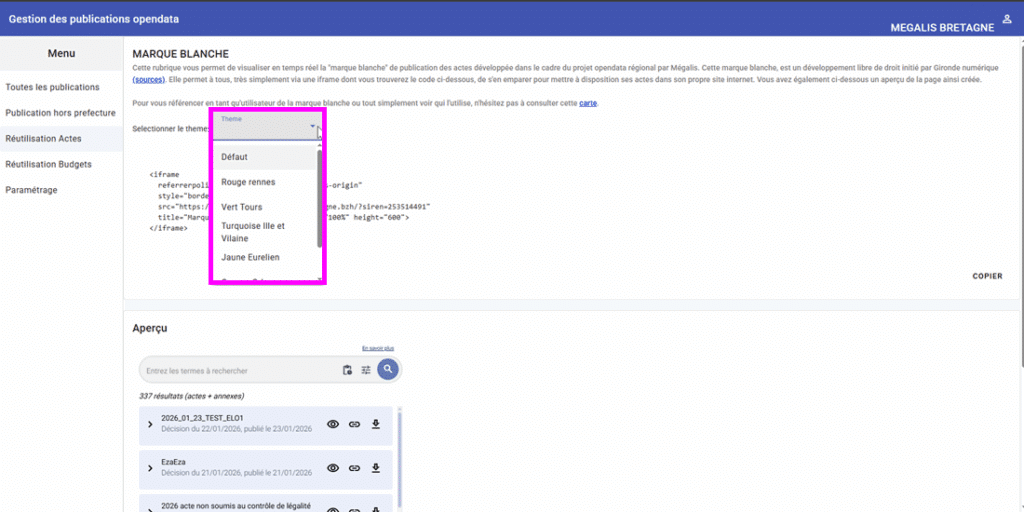 Dans le menu « Marque blanche » du service de publication opendata, vous pourrez visualiser en temps réel et de récupérer le code de la « marque blanche » développée dans le cadre du projet opendata régional par Mégalis.