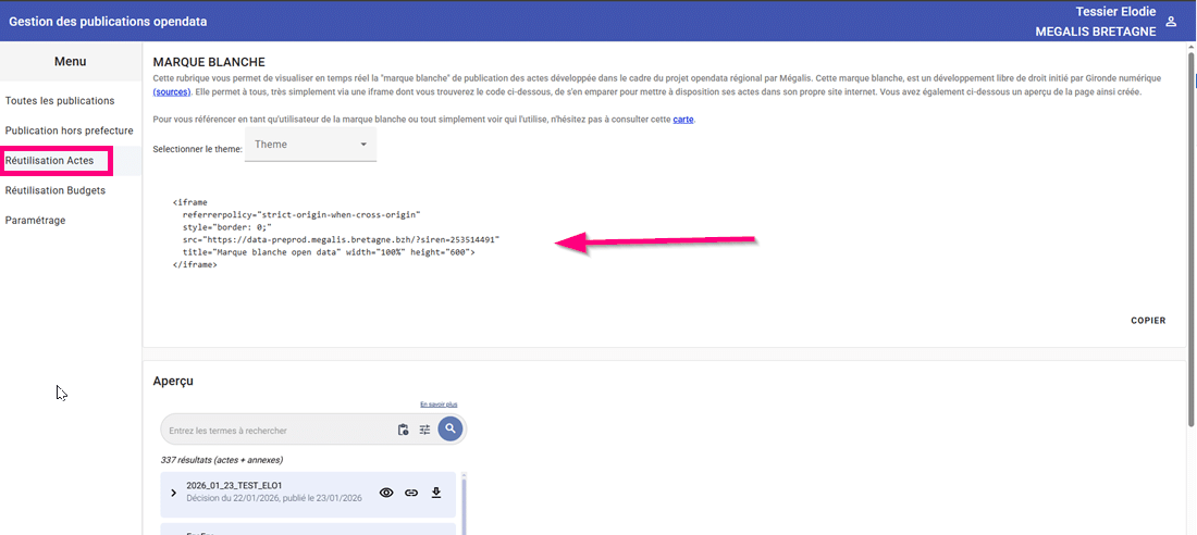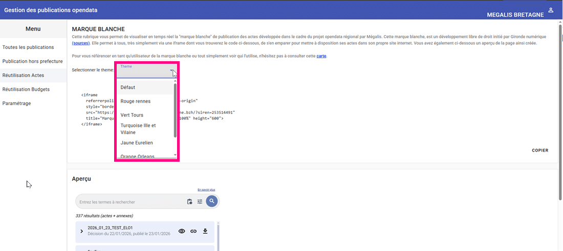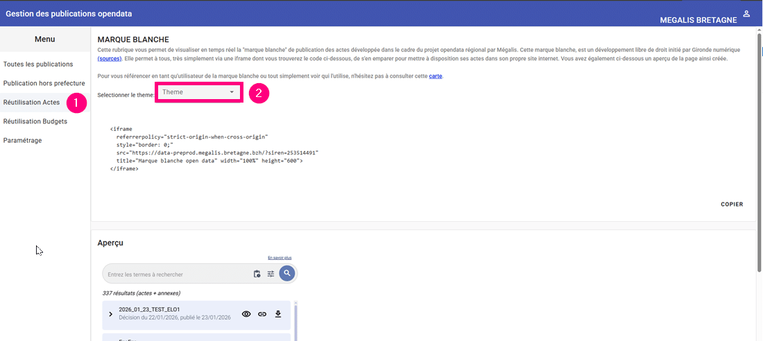 Dans le menu « Réutilisation Actes » du service de publication opendata, vous pourrez visualiser en temps réel et de récupérer le code de la « marque blanche » développée dans le cadre du projet opendata régional par Mégalis :