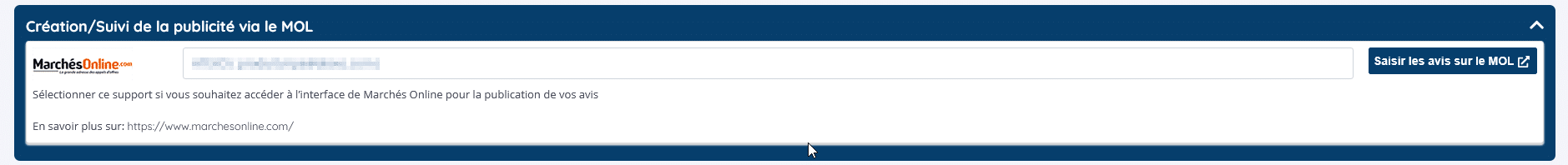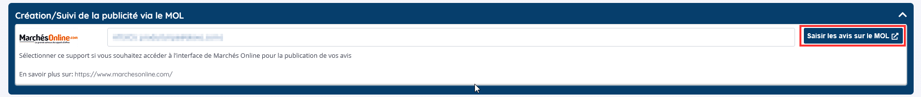 Cliquez sur le bouton “Saisir les avis sur le MOL” pour accéder au site de Marchés Online afin de saisir ou retrouver vos avis en cours de rédaction ou déjà publiés via le MOL.