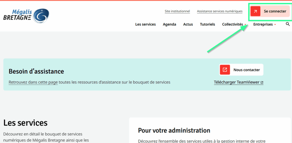 Allez sur le site services de Mégalis et cliquez sur Se connecter en haut à droite :