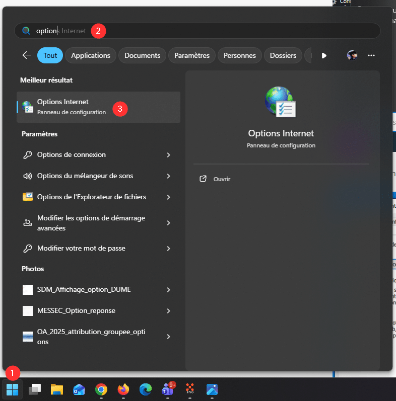 3 – Saisissez ensuite “Options internet” dans la barre de recherche (2) puis cliquez sur le résultat “Options internet” (3)