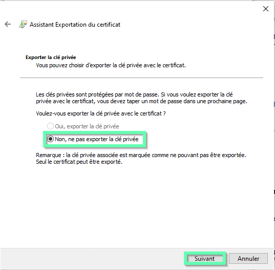 Choisir l’option “Non ne pas exporter la clé privée” puis cliquer sur “Suivant”