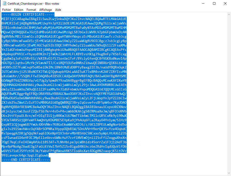 3 – Le fichier PEM s’ouvre dans le bloc-notes, Utilisez simultanément les touches « CTRL » et « A » de votre clavier pour sélectionner l’intégralité du contenu du fichier et copiez-le (« CTRL » et « C »)