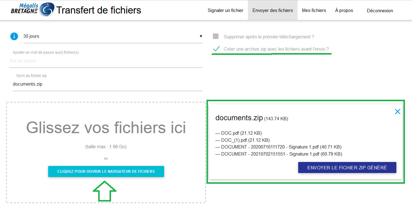 4. Vous pouvez aussi choisir l’option de créer un fichier zip de vos différents documents